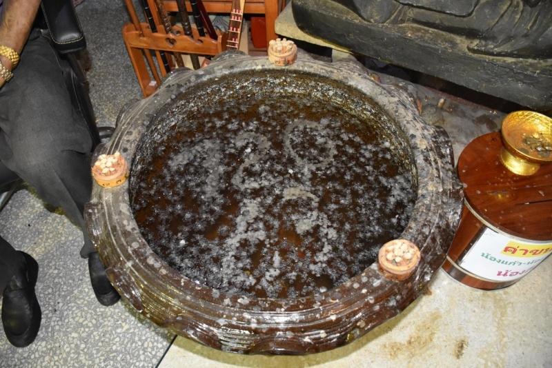 ขณะเดียวกัน บนศาลาการเปรียญ ยังคงมีสาธุชน รวมไปถึงบรรดานักเสี่ยงโชค เริ่มทยอยมาหาเลขเด็ดกันแล้ว โดยเฉพาะในอ่างน้ำมนต์หยดน้ำตาเทียนหน้าหุ่นปั้น ตาทอง งิ้วราย กันแต่เนิ่นๆ เพราะกลัวเลขเปลี่ยนเพราะแรงลมและสาธุชนเข้าไปใกล้ ซึ่งส่วนใหญ่เมื่อดูแล้วต่างมาจับกลุ่มวิจารณ์แลกเปลี่ยนตัวเลขที่เห็นกัน ในอ่างน้ำมนต์ส่วนใหญ่จะเห็นตัวเลขและนำไปตีเป็นเลข 720, 83 และ 63 โดยนักเสี่ยงโชคส่วนใหญ่จะนำมือถือมาถ่ายภาพในอ่างน้ำมนต์นำกลับบ้านไปให้ญาติหรือเพื่อนช่วยกันตีเลข