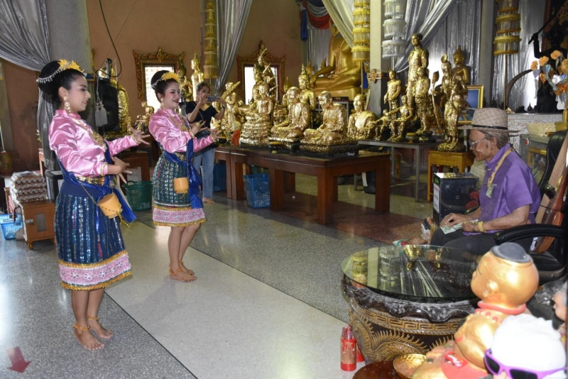 วันที่ 9 มิ.ย. 2563 ผู้สื่อข่าวรายงานว่า ที่วัดสว่างอารมณ์ ต.ขุนแก้ว อ.นครชัยศรี จ.นครปฐม บนศาลาการเปรียญ ที่หน้าหุ่นปั้น ตาทอง งิ้วราย ครอบครัวของ นางธัญญ่า วราคชพิทักษ์ อายุ 43 ปี ประกอบอาชีพธุรกิจส่วนตัว ได้นำนางรำ 2 คน แต่งตัวเป็นชุดประจำถิ่นภาคอีสานสีชมพู มาร่ายรำอย่างสนุกสนานเพื่อแก้บน หลังได้โชคลาภจากตาทองงิ้วราย ซึ่งบรรยากาศบนศาลาเป็นไปอย่างคึกคัก