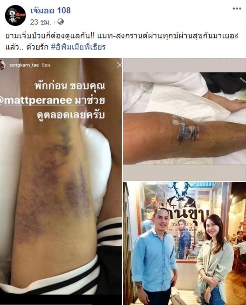 เกี่ยวกับเรื่องนี้ ทางเพจดัง เจ๊มอย108 ก็ได้นำโมเมนต์น่ารักๆ ดังกล่าวไปแชร์ให้ลูกเพจทั้งหลายได้ทราบข่าวคราว ความเคลื่อนไหวของคู่รักคู่นี้กัน พร้อมระบุข้อความว่า ยามเจ็ บป่ว ยก็ต้องดูแลกันแมท-สงกรานต์ผ่านทุกข์ผ่านสุขกัน มาเยอะแล้ว ด้วยรัก อิพิมเมียพี่เธียร ซึ่งก็ได้มีชาวโซเชียลเข้ามาคอมเม้นต์อย่างหลากหลายเช่นเดิม