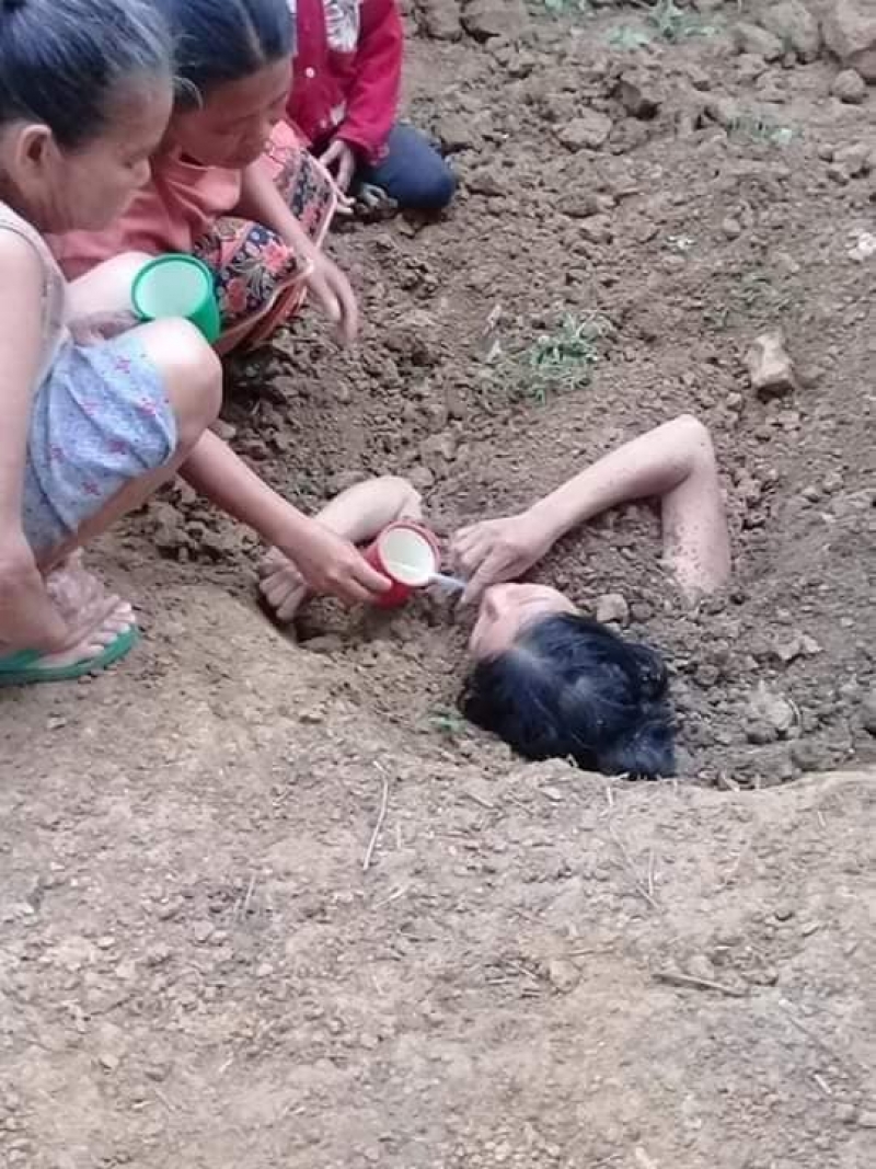 ใครเห็นเป็นต้องตกใจ เมื่อมีการเผยแพร่ภาพชาวบ้านกำลังป้อนน้ำให้กับคนที่ถูกฝังไว้ใต้ดินโผล่ออกมาแค่ส่วนหัว แต่พวกเขาบอกว่านี่เป็นวิธีรักษาคนที่แพ้เห็ดตามความเชื่อโบราณ